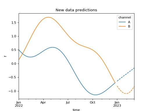 import numpy as np import pandas as pd import pymc as pm import matplotlib.pyplot as plt from pymc_marketing.mmm import HSGP from pymc_extras.prior import Prior seed = sum(map(ord, "New data predictions")) rng = np.random.default_rng(seed) eta = Prior("Exponential", lam=1) ls = Prior("InverseGamma", alpha=2, beta=1) hsgp = HSGP( eta=eta, ls=ls, m=20, L=150, dims=("time", "channel"), ) n = 52 X = np.arange(n) dates = pd.date_range("2022-01-01", periods=n, freq="W-MON") coords = {"time": dates, "channel": ["A", "B"]} with pm.Model(coords=coords) as model: data = pm.Data("data", X, dims="time") hsgp.register_data(data).create_variable("f") idata = pm.sample_prior_predictive(random_seed=rng) prior = idata.prior n_new = 10 X_new = np.arange(n, n + n_new) new_dates = pd.date_range("2023-01-01", periods=n_new, freq="W-MON") with model: pm.set_data( new_data={ "data": X_new, }, coords={"time": new_dates}, ) post = pm.sample_posterior_predictive( prior, var_names=["f"], random_seed=rng, ) chain, draw = 0, 50 colors = ["C0", "C1"] def get_sample(curve): return curve.loc[chain, draw].to_series().unstack() ax = prior["f"].pipe(get_sample).plot(color=colors) post.posterior_predictive["f"].pipe(get_sample).plot( ax=ax, color=colors, linestyle="--", legend=False ) ax.set(xlabel="time", ylabel="f", title="New data predictions") plt.show()